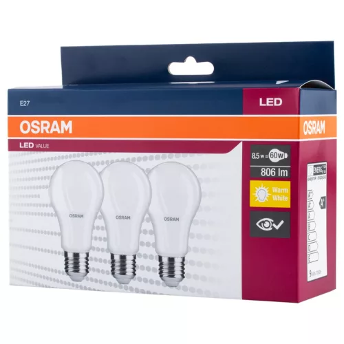 3db LED izzó A60 E27 8,5W = 60W 806lm 2700K OSRAM érték