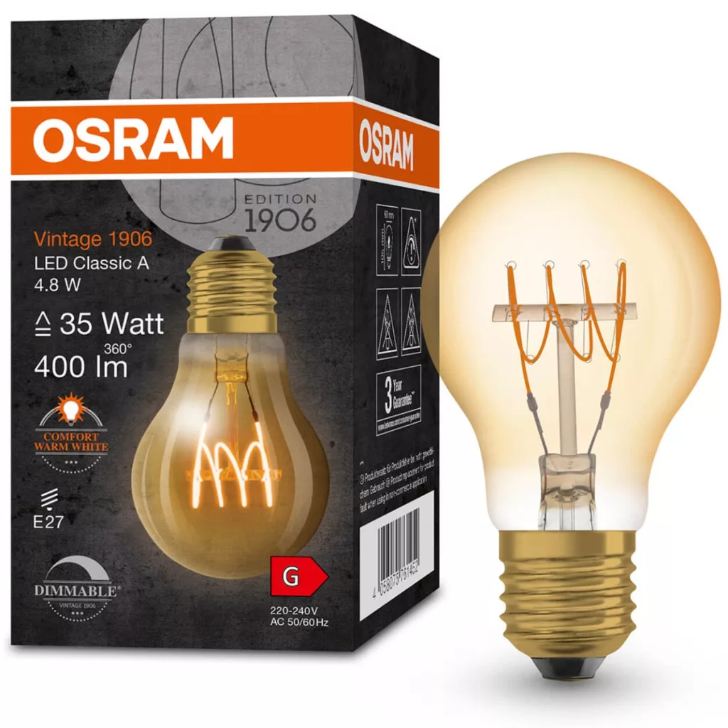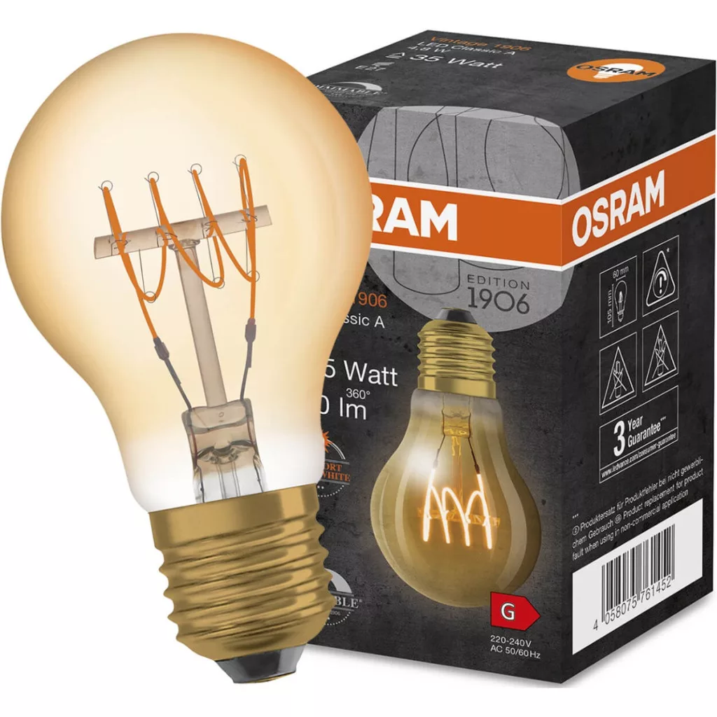 Az A60-as formájú dekoratív LED izzó a neves és elismert OSRAM cég legújabb terméke a világítástechnikában. Az E27-es talpú VINTAGE 1906 stílusú LED izzó egy elegáns formájú, üvegburába zárt, kiváló minőségű LED fényforrás. A bemutatott izzószálas izzó kiválóan alkalmas dekorációs világításra házainkban vagy lakásainkban. Klasszikus megjelenése hangulatos karaktert kölcsönöz fészkének, szeme pedig ellazul a kellemes fényben. Az izzó a legmodernebb energiatakarékos LED diódák technológiájával készült, amelyeket a világítási paraméterek magas hatékonysága és a kivételesen hosszú élettartam jellemez .