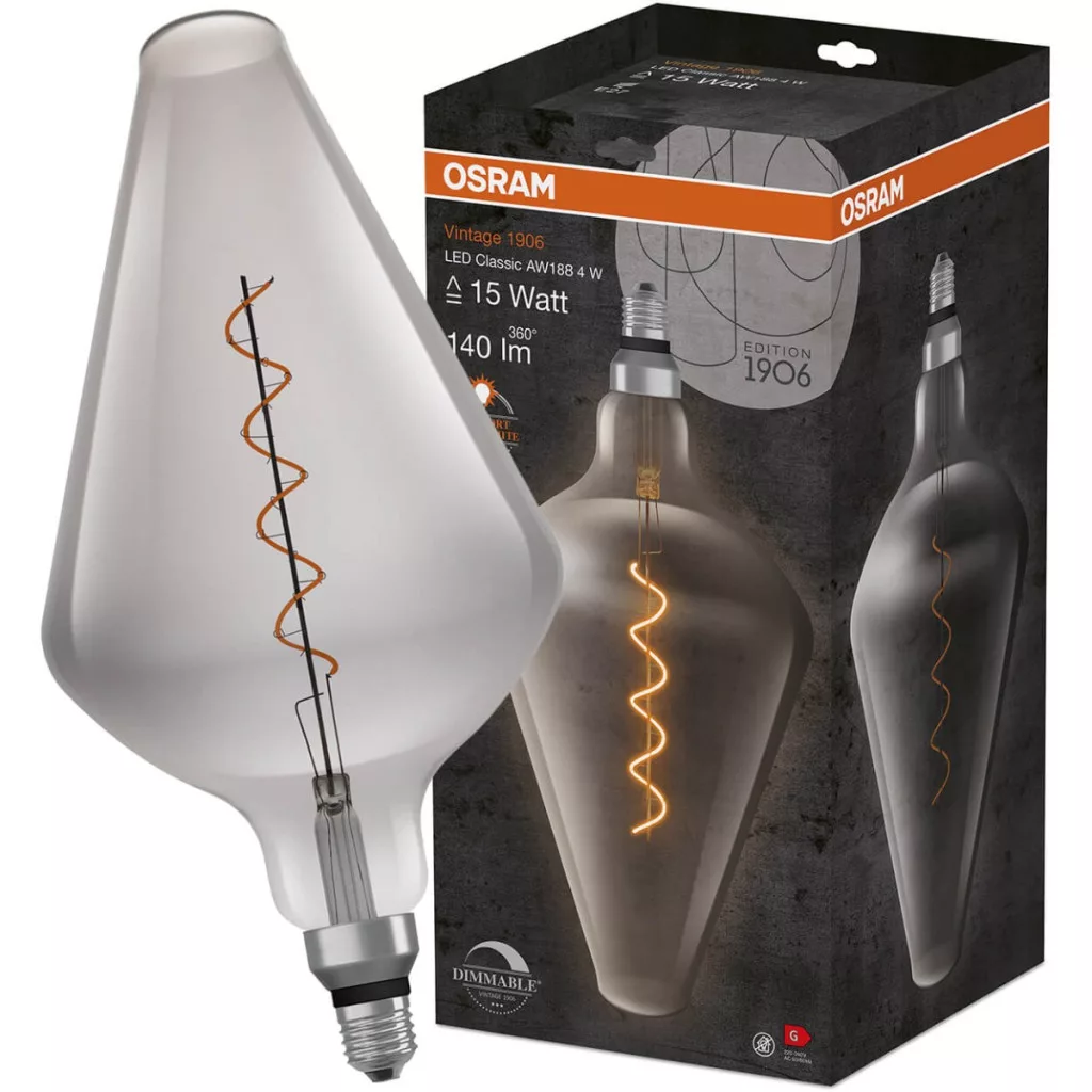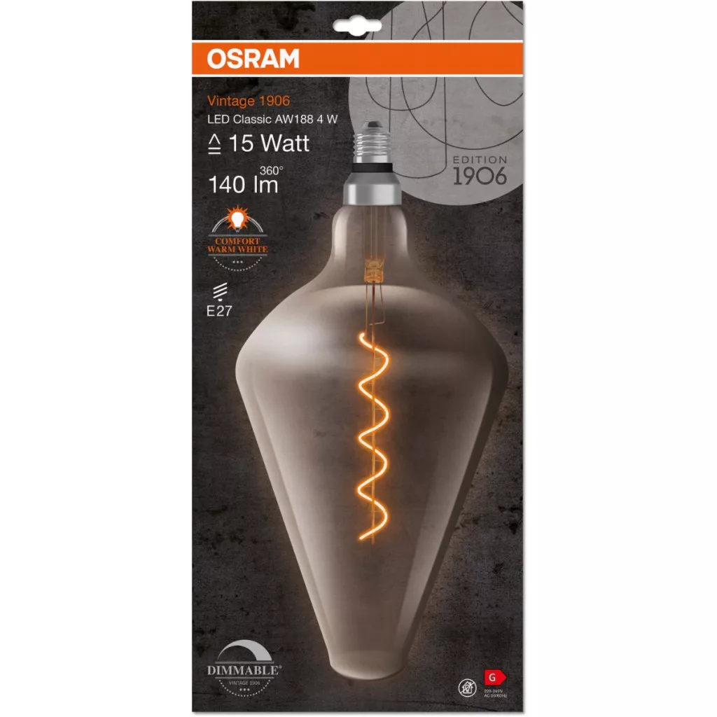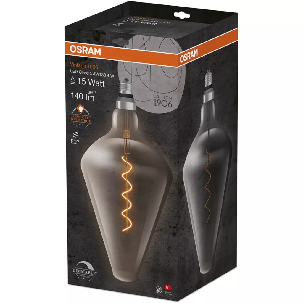 Az AW188 formájú dekoratív LED izzó a neves és elismert OSRAM cég legújabb terméke a világítástechnikában. Az E27-es talpú VINTAGE 1906 stílusú LED izzó egy füstös üvegbe zárt, elegáns formájú, minőségi LED fényforrás. A bemutatott izzószálas izzó kiválóan alkalmas dekorációs világításra házainkban vagy lakásainkban. Klasszikus megjelenése hangulatos karaktert kölcsönöz fészkének, szeme pedig ellazul a kellemes fényben. Az izzó a legmodernebb energiatakarékos LED diódák technológiájával készült, amelyeket a világítási paraméterek magas hatékonysága és a kivételesen hosszú élettartam jellemez .