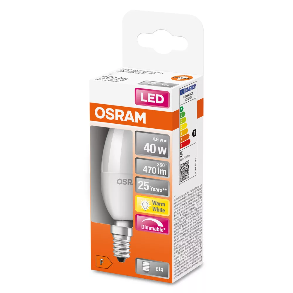 E14 B35 LED izzó 4,9W = 40W 470lm 2700K 280° OSRAM szabályozható