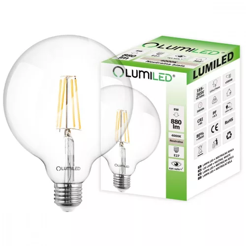 E27 G125 LED izzó 8W = 65W 880lm 4000K semleges 360°-os LUMILED izzószál