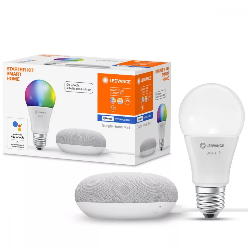 E27 LED izzó 10W RGB + CCT A60 SMART + Bluetooth LEDVANCE + Google Home Mini hangszóró szürke