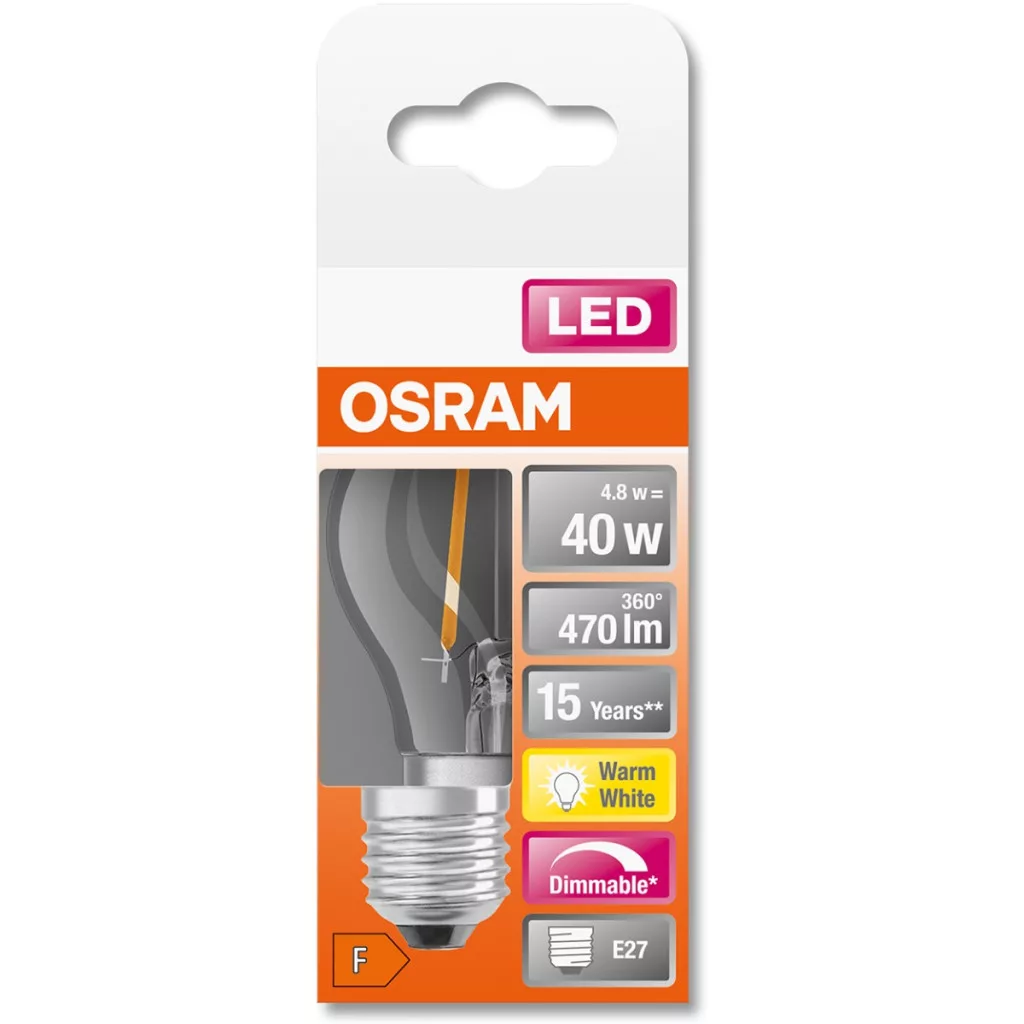 LED izzó E27 P45 CL 4.8W = 40W 470lm 2700K 320°-os izzószál szabályozható