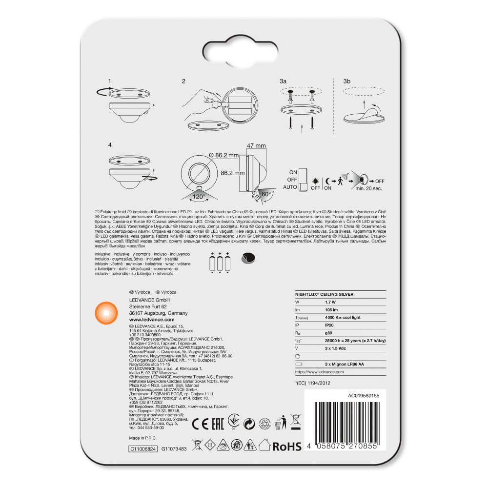Nightlux mennyezeti LED éjszakai lámpa ezüst 1,70 W 105lm 4000K IP20 Ledvance mozgásérzékelő