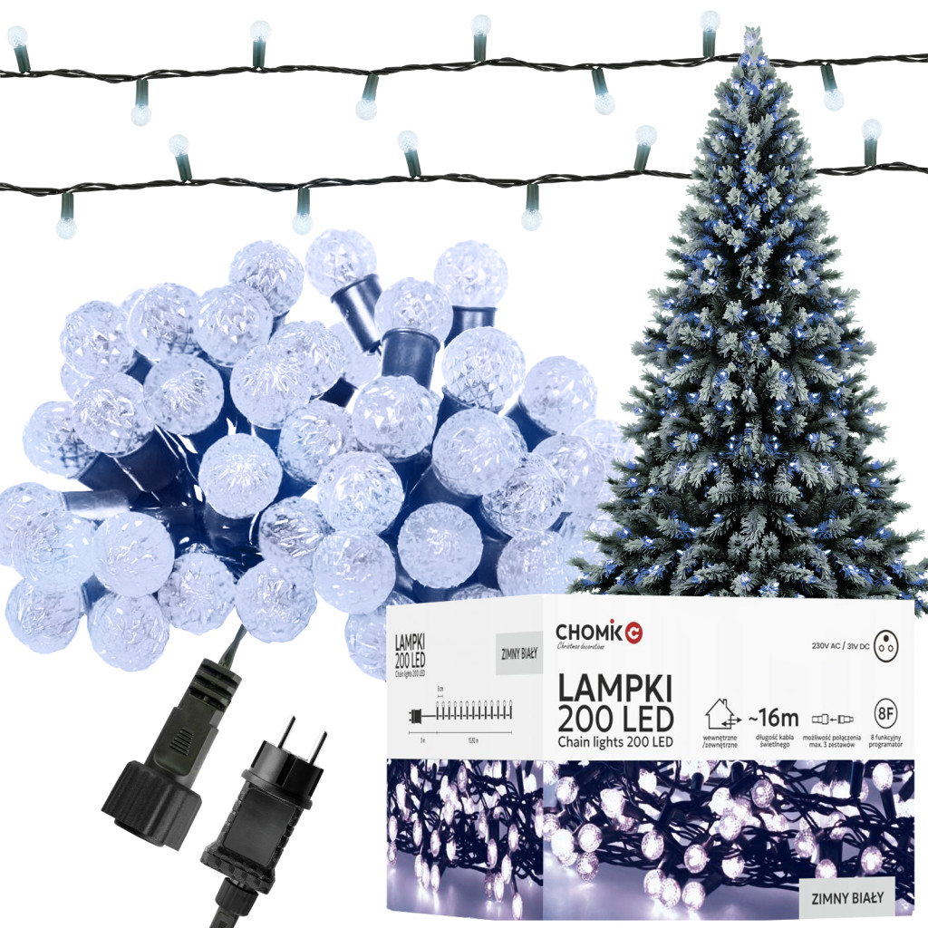Fényfüggöny karácsonyi fények CSERESZNYA GOLYÓ 200LED Hideg fehér 3+16m