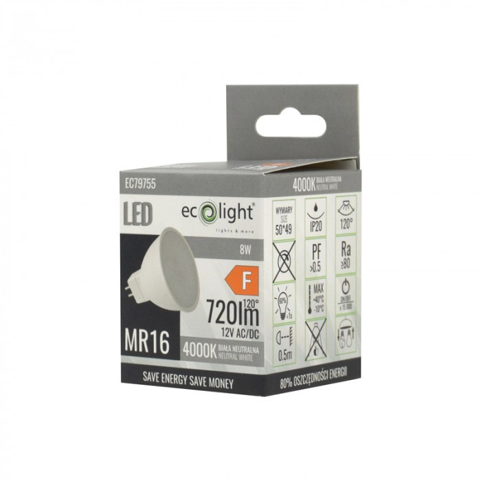 LED izzó reflektor MR16 GU5.3 8W 640lm 4000K semleges 12V Ecolight