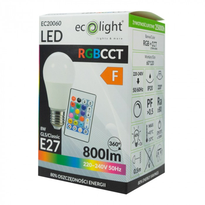 LED izzó A60 E27 8W 800lm Többszínű RGB + CCT Dimmable Ecolight Távirányítóval