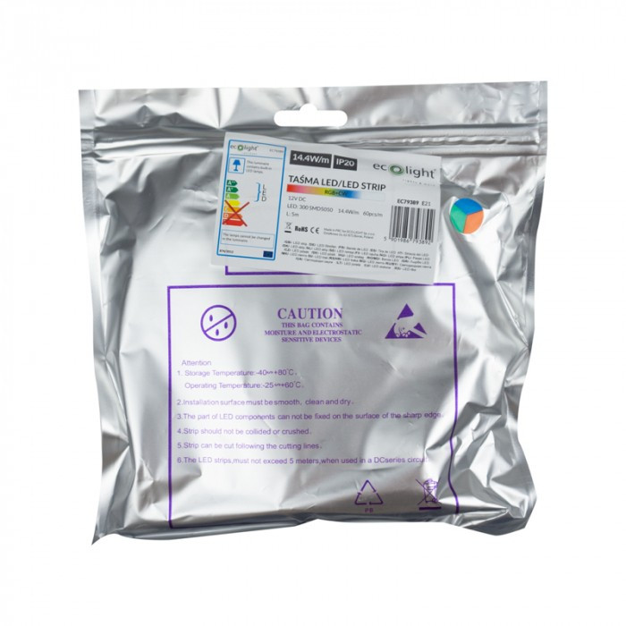 LED szalag SMD 5050 14.4W/m 60LED/m 12V 6500K Többszínű RGB + Hidegfény IP20 5m Tekercs Ecolight