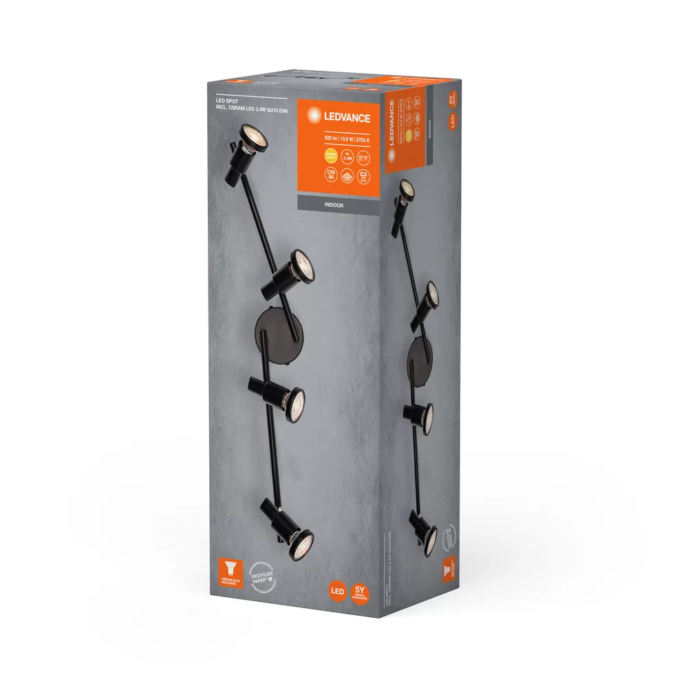 LED mennyezeti fali lámpa spotlámpa 4 pontban állítható 13,6 W GU10 fekete LEDVANCE