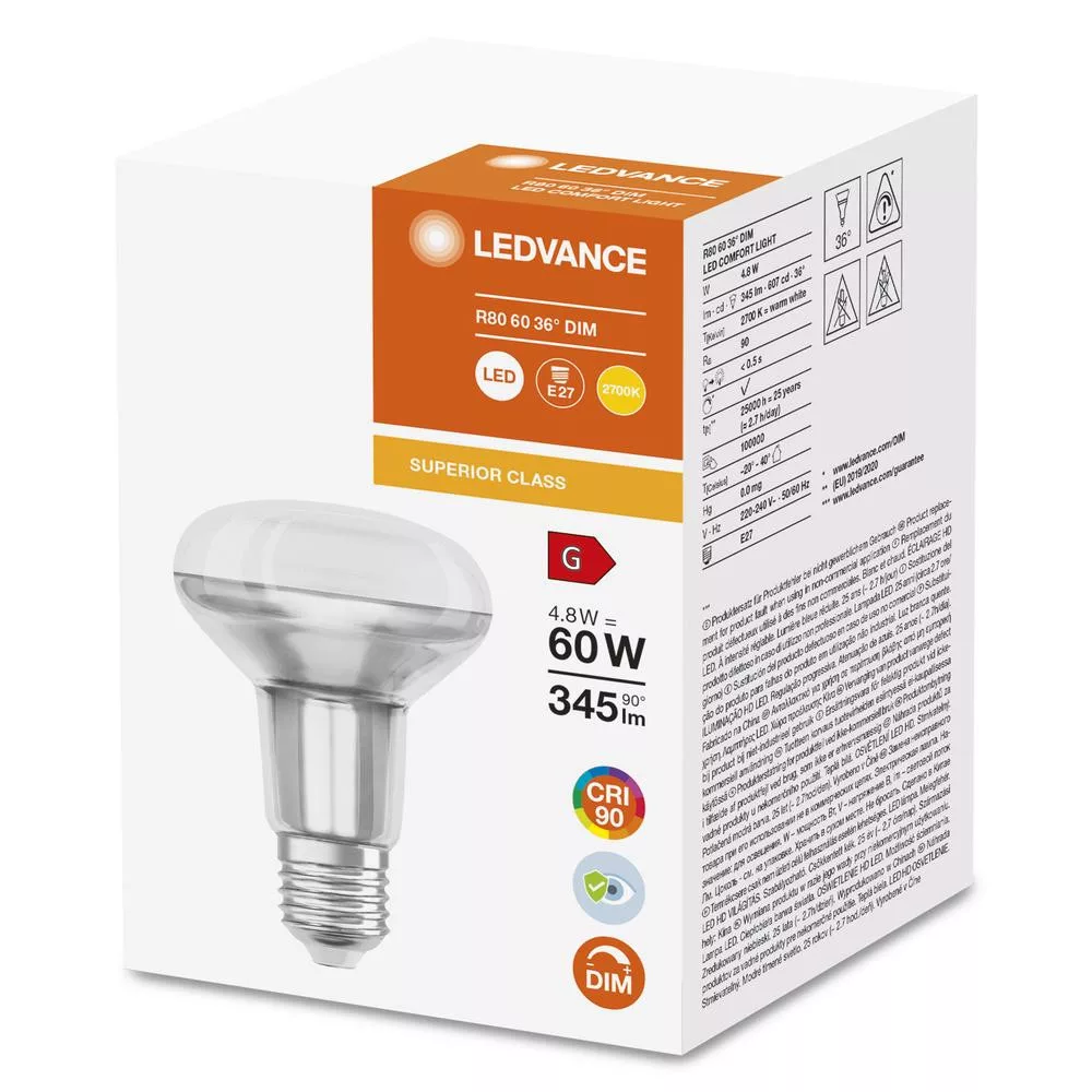 LED izzó reflektor E27 R80 4.8W = 60W 345lm 2700K Meleg 36° CRI90 Szabályozható Ledvance