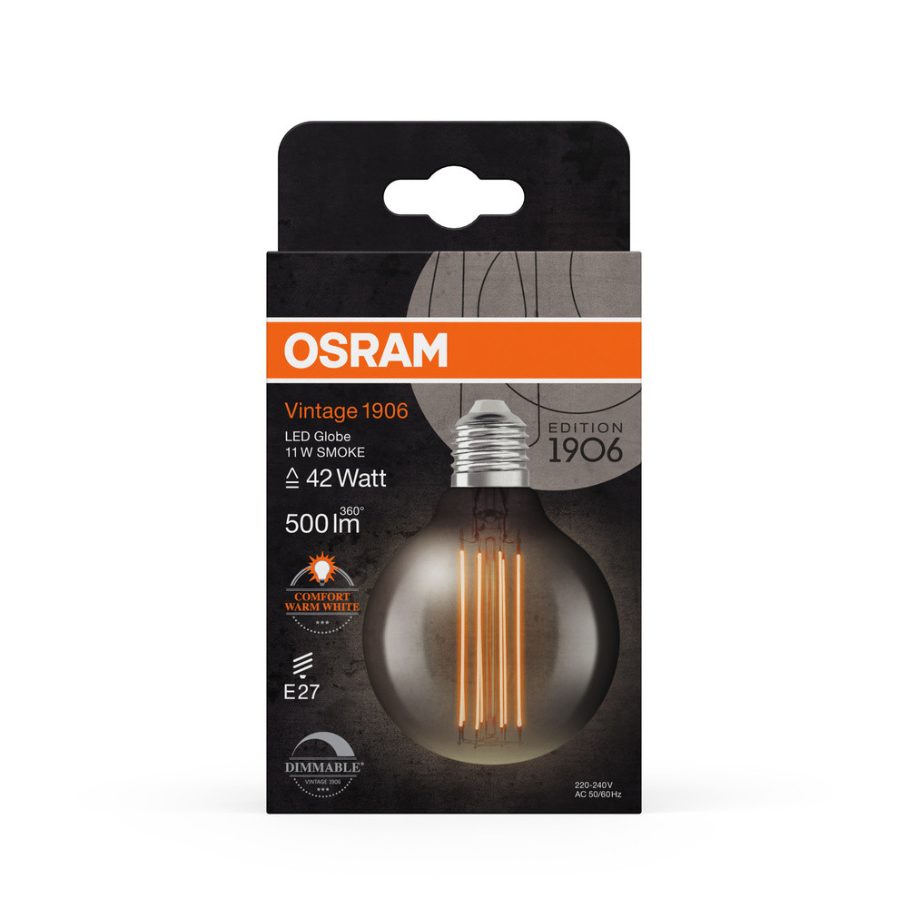 LED dekoratív izzó G80 gömb alakú E27 11W = 42W 500lm 1800K Meleg 320° Füstölt Izzószálas Szabályozható Vintage 1906 Osram