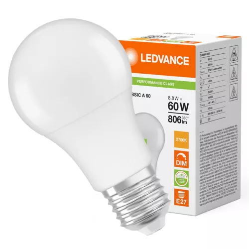 LED izzó E27 A60 8.8W = 60W 806lm 2700K Meleg 200° Szabályozható Ledvance