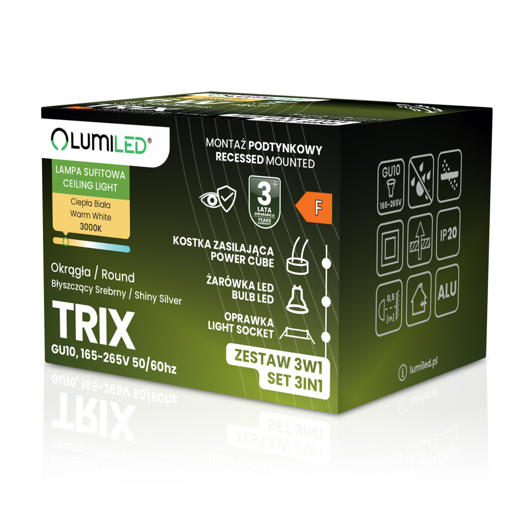 Süllyesztett halogén lámpatest, kerek, mozgatható, TRIX 3 az 1-ben GU10, 6W, 3000K, ezüst, LUMILED