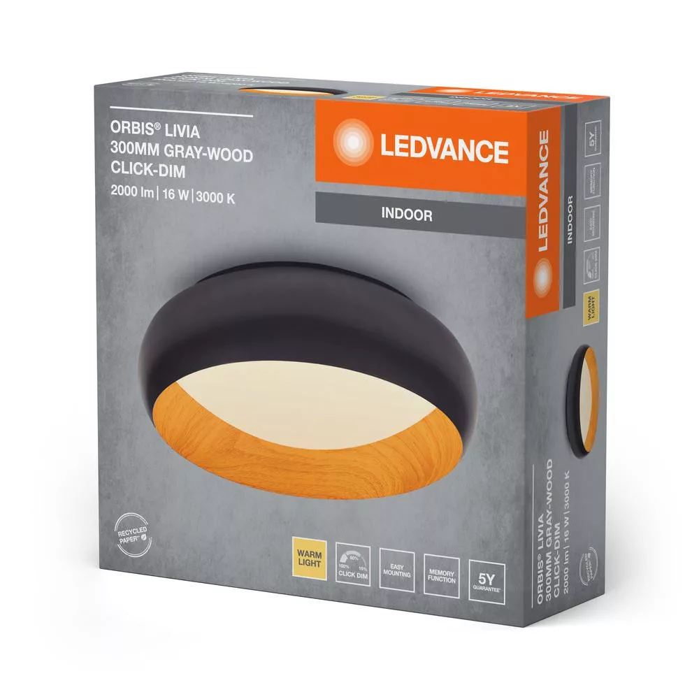 LED Mennyezeti Lámpa Felületre Szerelt 16W 750lm 3000K Meleg, Szabályozható Fényű Szürke Fa 30cm Orbis Ledvance