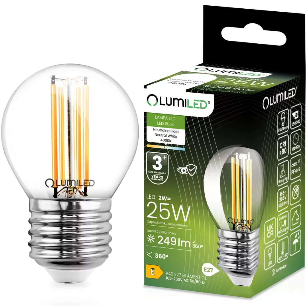 LED izzó E27 P40 Izzószál 2W = 25W 249lm 4000K Semleges 360° LUMILED