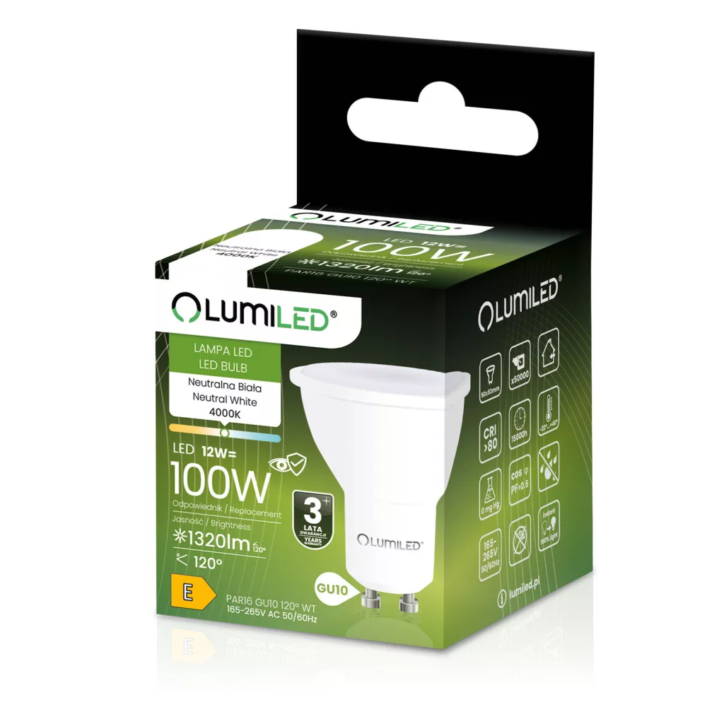 LED izzó GU10 spotlámpa PAR16 12W = 100W 1320LM 4000K semleges 120° LUMILED