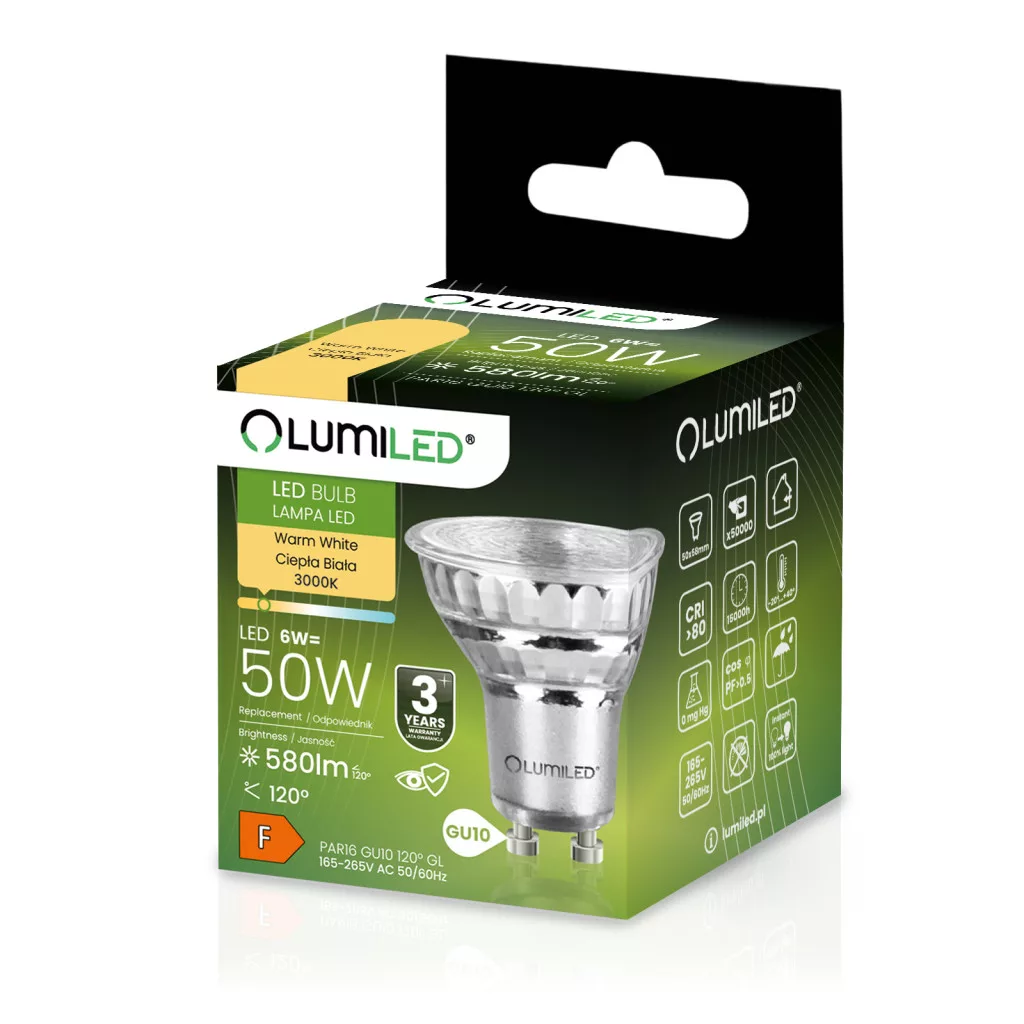 GU10 LED izzó 6W = 50W 580lm 3000K meleg 120°-os üveg LUMILED