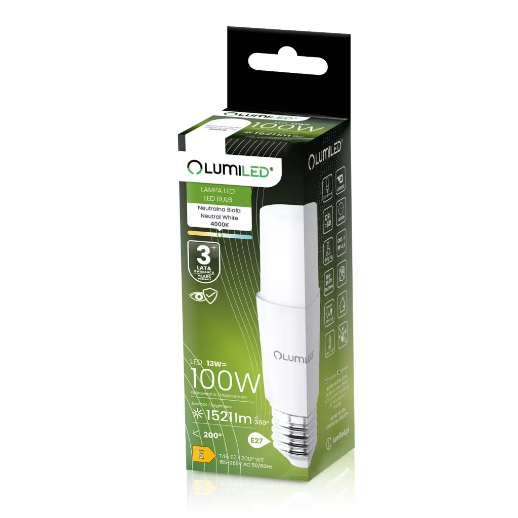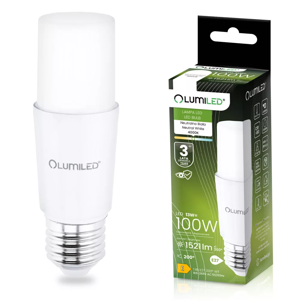 E27 cső alakú LED izzó T45 13W = 100W 1521lm Meleg 3000K 200° LUMILED