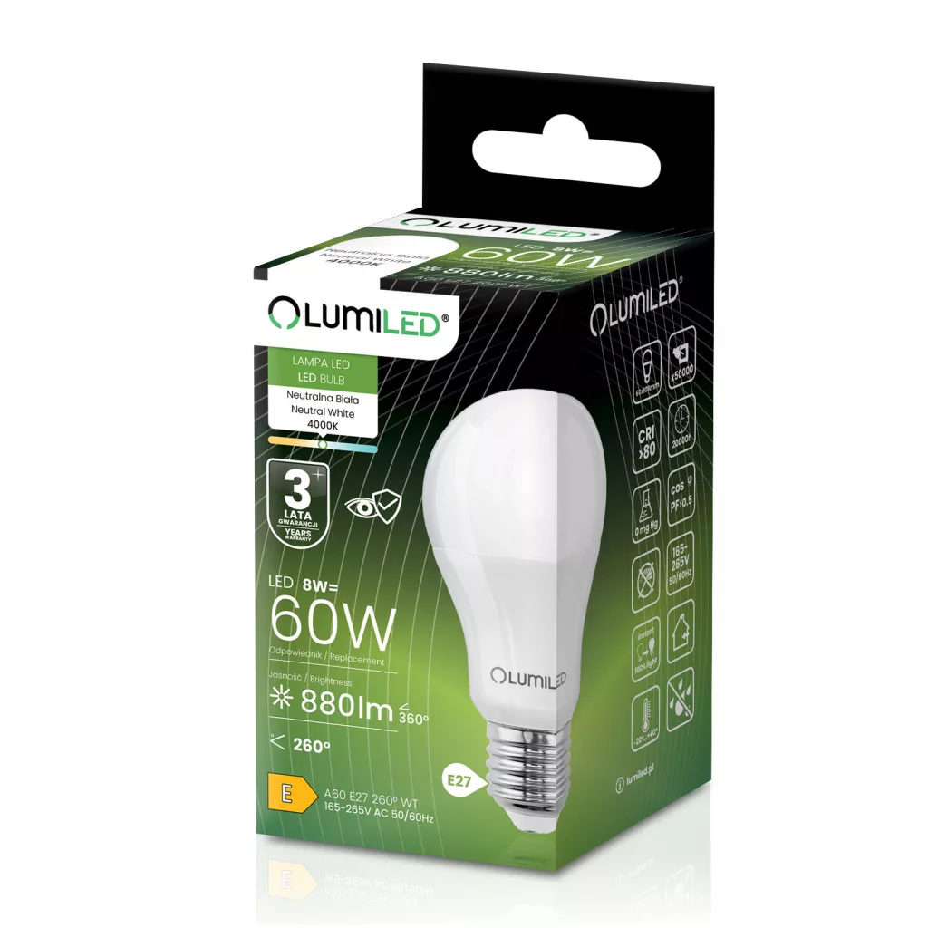 LED izzó E27 A60 8W = 60W 880lm 4000K Semleges 260° LUMILED