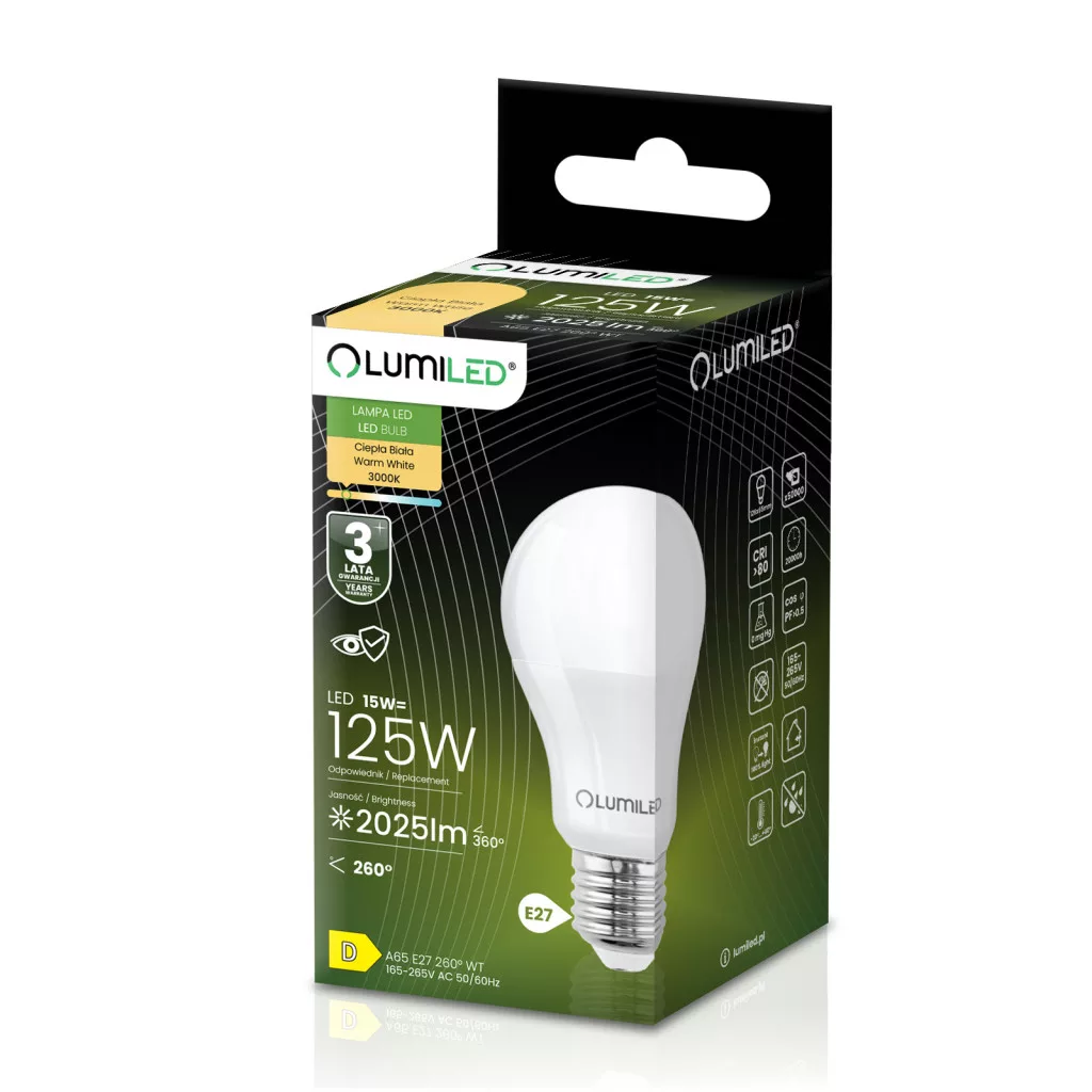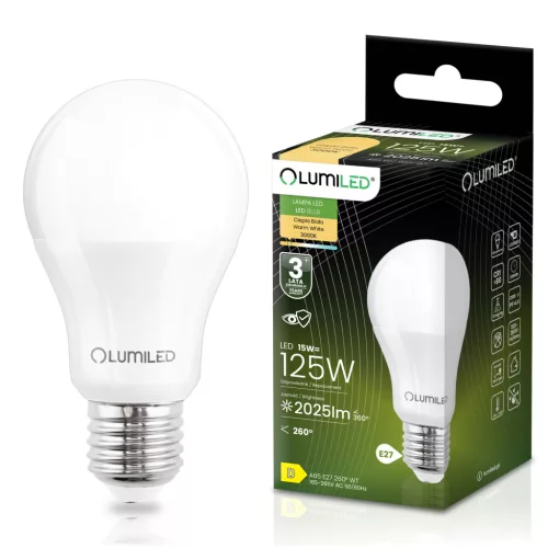 LED izzó E27 A65 15W = 125W 2025lm 3000K Meleg 260° LUMILED