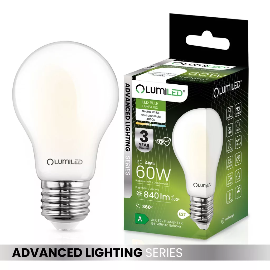 E27 A60 LED izzó 4W = 60W 840lm 4000K Semleges 360°-os üvegszál ALS LUMILED
