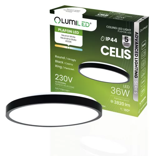LED mennyezeti lámpa, felületre szerelt 36W 4000K 3820lm 106 lm/W CELIS kerek IP44 fekete gyűrű ALS LUMILED