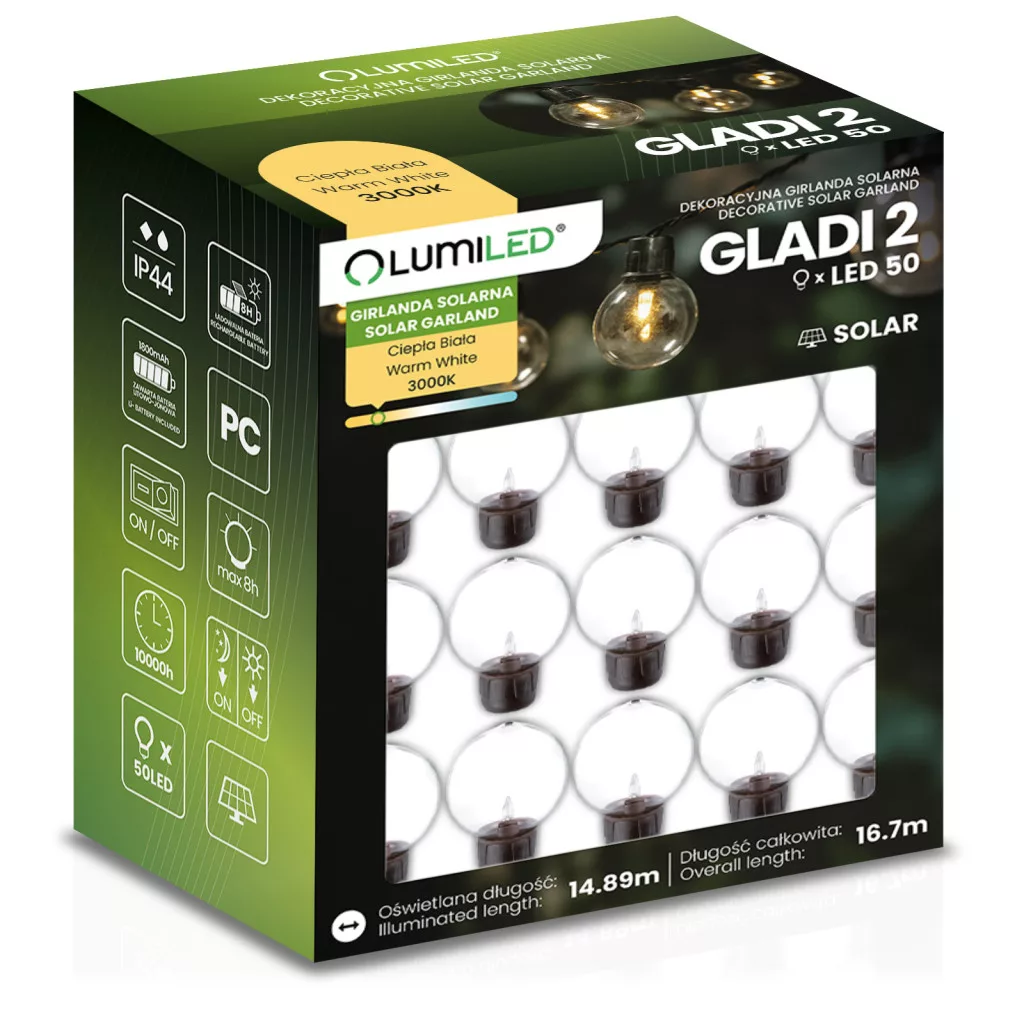 Kerti Solar GIRLAND 50x LED dekoratív golyók 16,7 m meleg 3000K GLADI 2 LUMILED