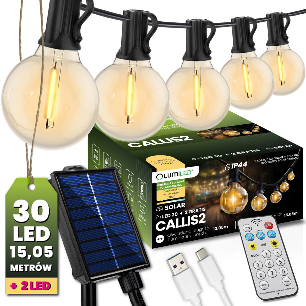 Napelemes kerti girland, 30 db LED dekoratív gömb, 15,05 m, 2700 K, meleg színhőmérséklettel, távirányítóval, CALLIS2, LUMILED