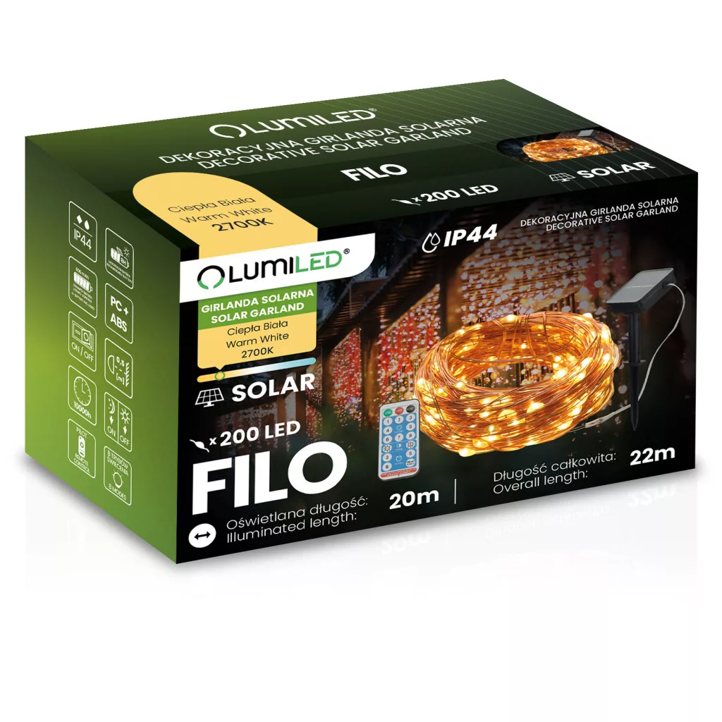 Napelemes kerti girland 200x LED dekoratív vezeték 22m 3000K Meleg + FILO LUMILED távirányító