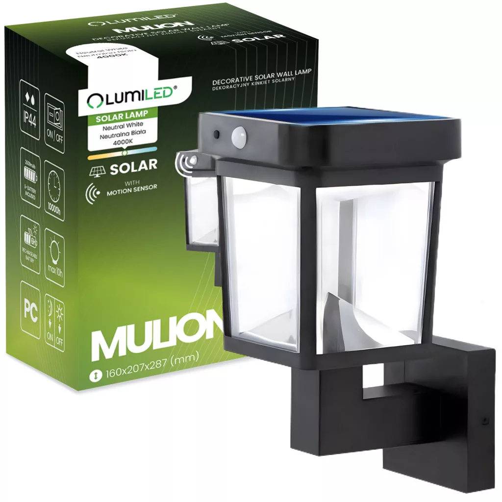 Napelemes fali lámpa LED homlokzati lámpa 4000K IP44 mozgás- és szürkületérzékelő MULION LUMILED