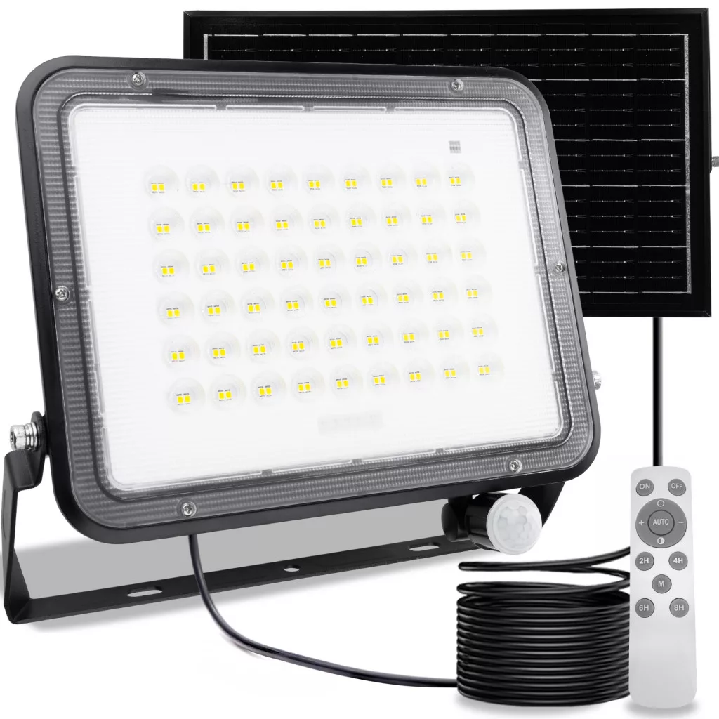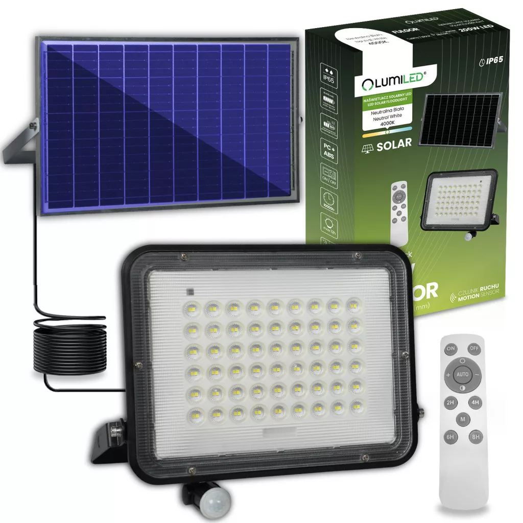 Napelemes LED halogén reflektor 200W kerti lámpa 4000K IP65 PIR mozgásérzékelő + távirányító FULGOR LUMILED