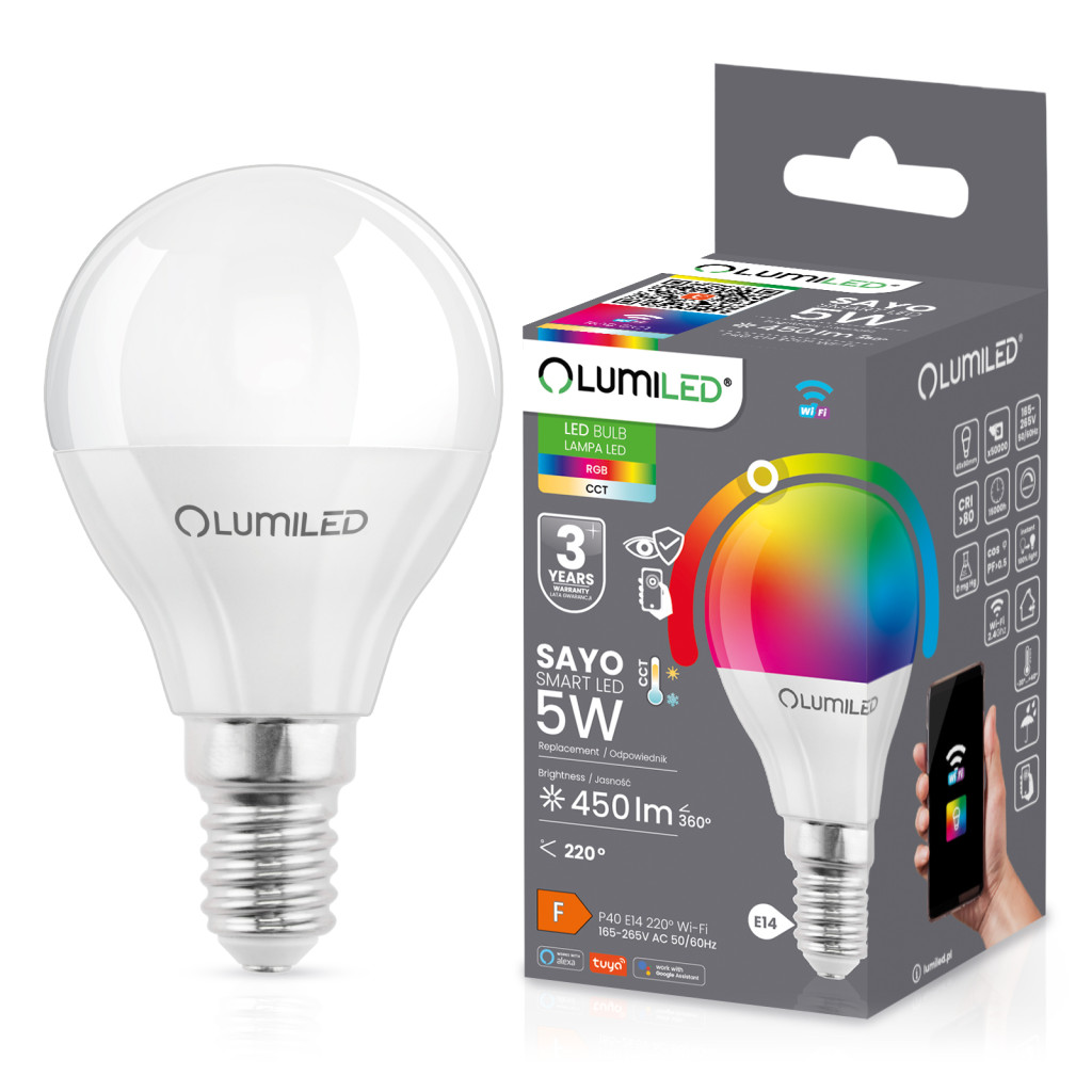 LED izzó E14 P40 BALL 5W = 40W 450lm RGB CCT szabályozható Smart TUYA WiFi SMART SAYO LUMILED