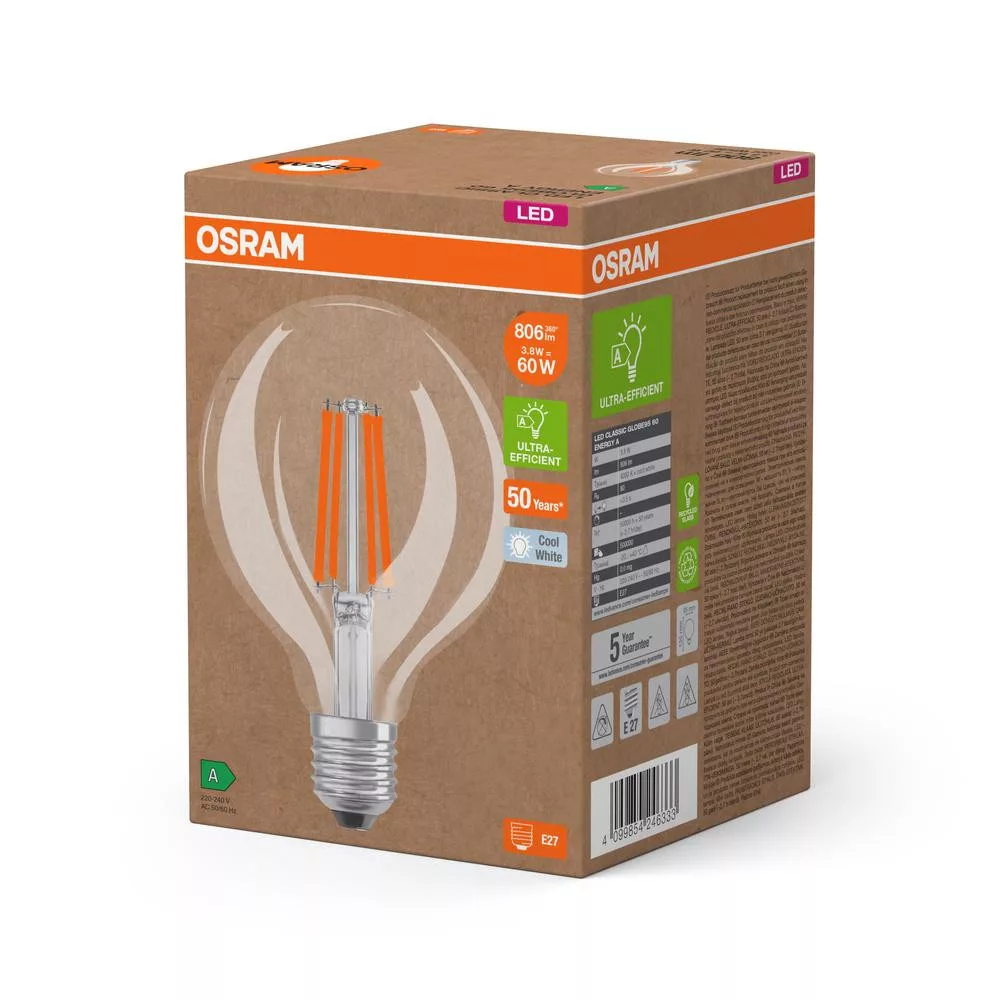 LED izzó G95 gömb alakú E27 3,8 W = 60 W 806 lm 4000 K semleges 300° izzószálas KLASSZIKUS ENERGIAHATÉKONYSÁG Osram