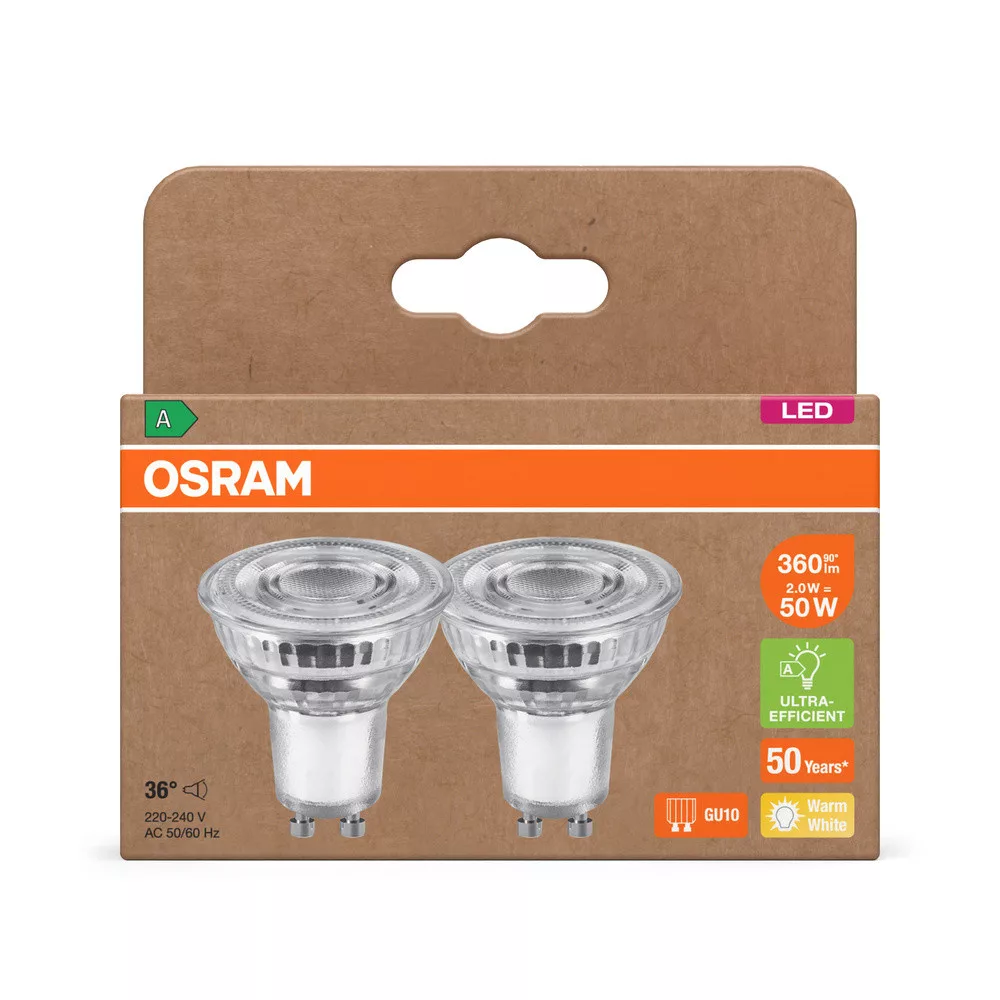 2x LED izzó PAR16 reflektor GU10 2W = 50W 360lm 2700K Meleg 36° 180lm/W ENERGIAHATÉKONYSÁG Osram