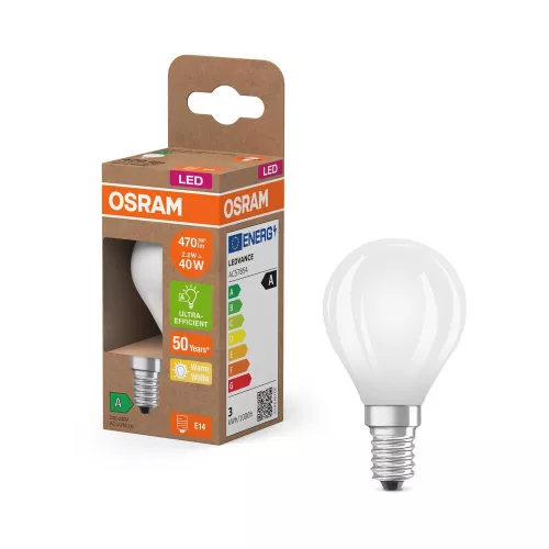 LED izzó P45 gömb alakú E14 2.2W = 40W 470lm 2700K Meleg 330° 214lm/W ENERGY CLASSIC EFFICIENCY Osram