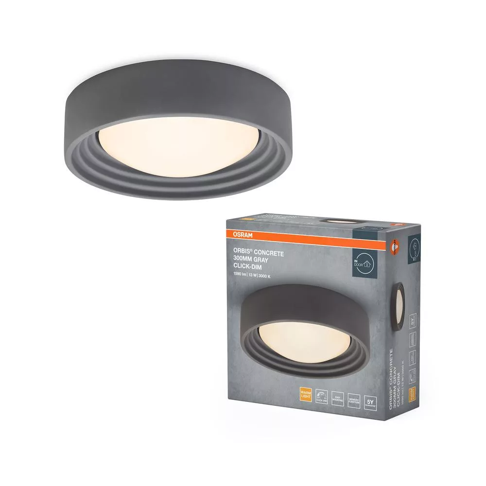 LED mennyezeti lámpa, felületre szerelhető, 13W, 800lm, 3000K, meleg, 116°, szürke, szabályozható fényerővel, Orbis Concrete, Osram