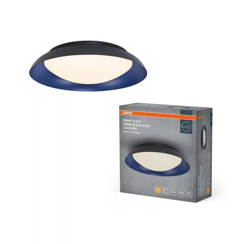 LED mennyezeti lámpa, felületre szerelhető, 35W, 1700lm, 3000K, meleg, 120°, fekete, kék, szabályozható fényerővel, Orbis Plate, Osram