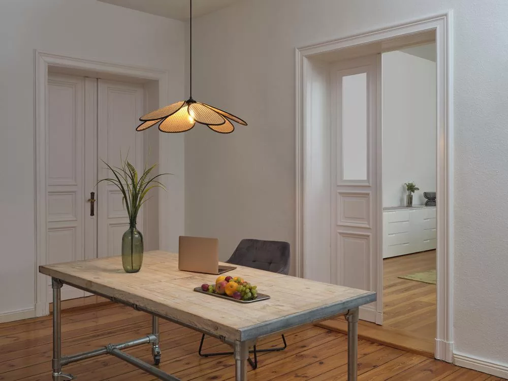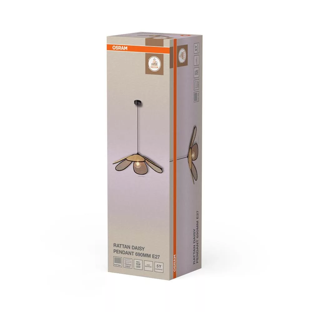 Dekoratív függő mennyezeti lámpa, E27, bézs színű, rattanból készült, százszorszép formájú, gyöngyházfényű, Osram