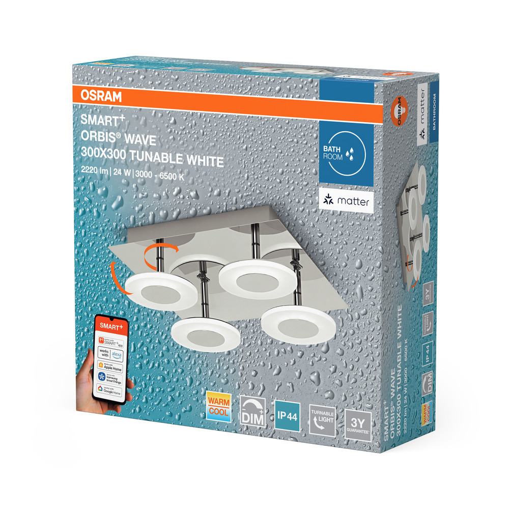 LED Fürdőszobai Lámpa Felületre Szerelhető 24W 1500lm 3000-6500K CCT Négyzet Ezüst IP44 Smart+ WiFi Matter Orbis Osram