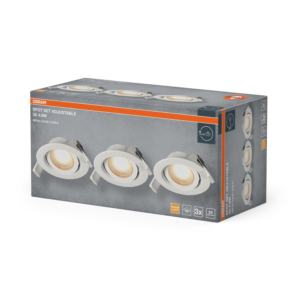 3 db süllyesztett halogén LED mennyezeti spotlámpa, mozgatható, kerek, 4,9 W, 220 lm, 2700 K, meleg fehér, süllyesztett, Osram