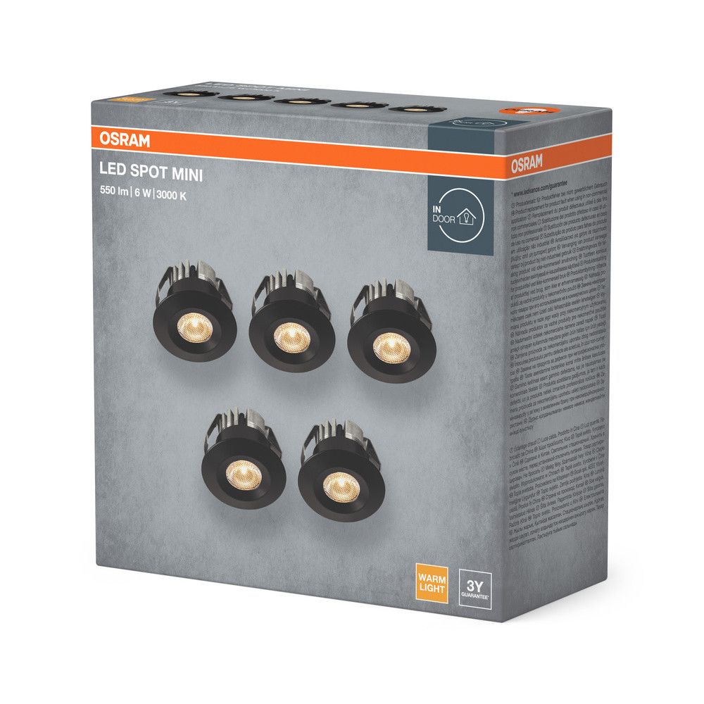 5 db-os LED spot mennyezeti lámpa szett, süllyesztett, hermetikus, IP44, fürdőszoba, kerek, 6W, 450lm, 3000K, meleg fehér, IP44, fekete, Mini Osram