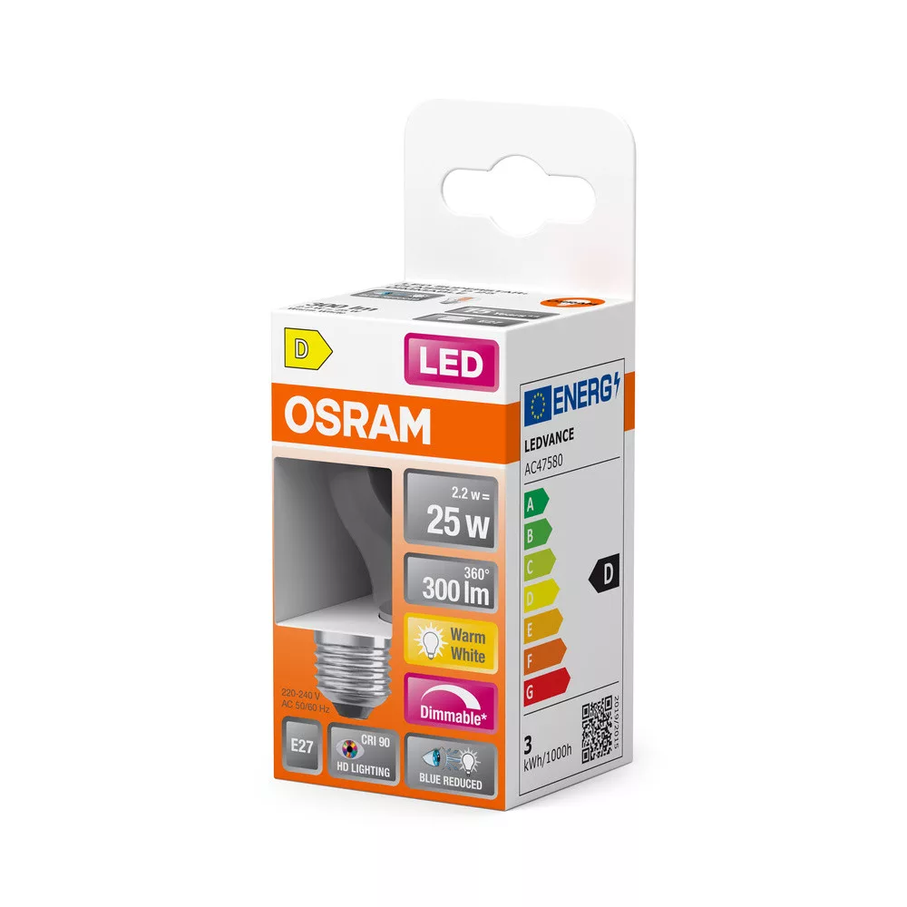 LED izzó P45 gömb alakú E27 2.2W = 25W 300lm 2700K Meleg CRI90 300° Izzószálas, szabályozható fényerejű SUPERSTAR PLUS CLASSIC Osram