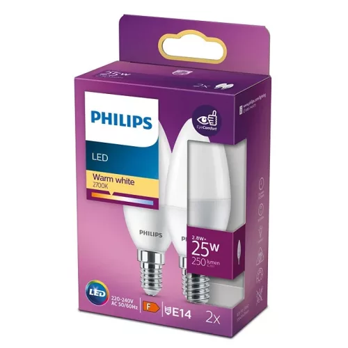 2 db LED-es gyertyakörte készlet E14 B35 2,8W = 25W 250lm 2700K meleg PHILIPS