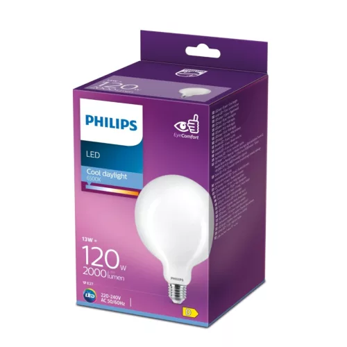 LED izzó E27 gömb alakú G120 13W = 120W 2000lm 6500K hideg izzószálas LED Classic Philips