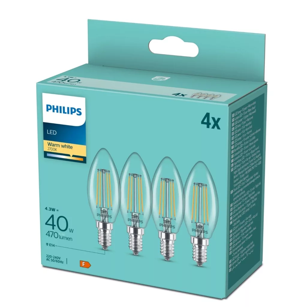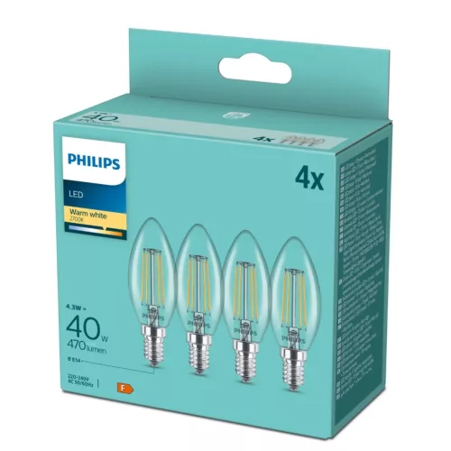 4x LED izzó E14 gyertya B35 4.3W = 40W 470lm 2700K Meleg 300° Filament Essential Philips