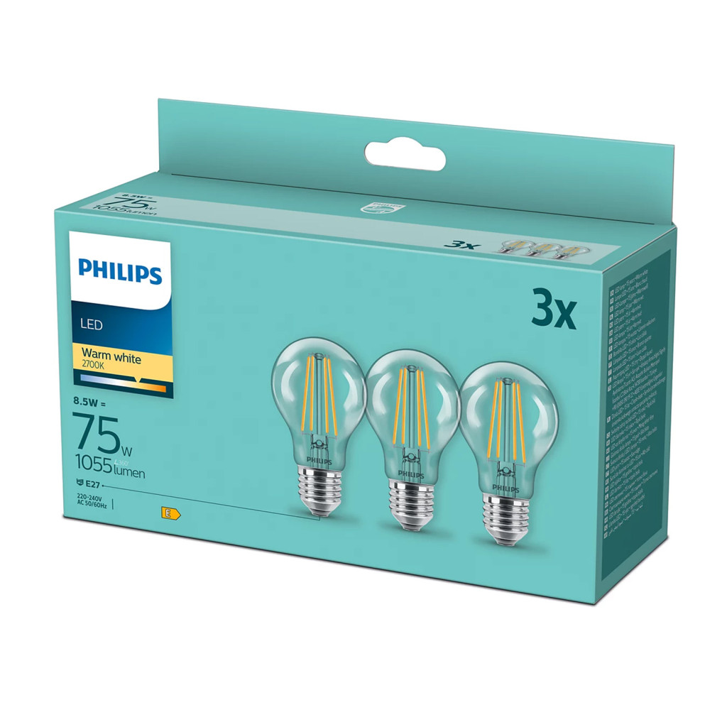 3PAK LED izzó E27 A60 8.5W = 75W 1055lm 2700K meleg izzószál PHILIPS
