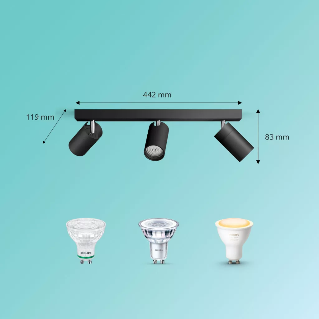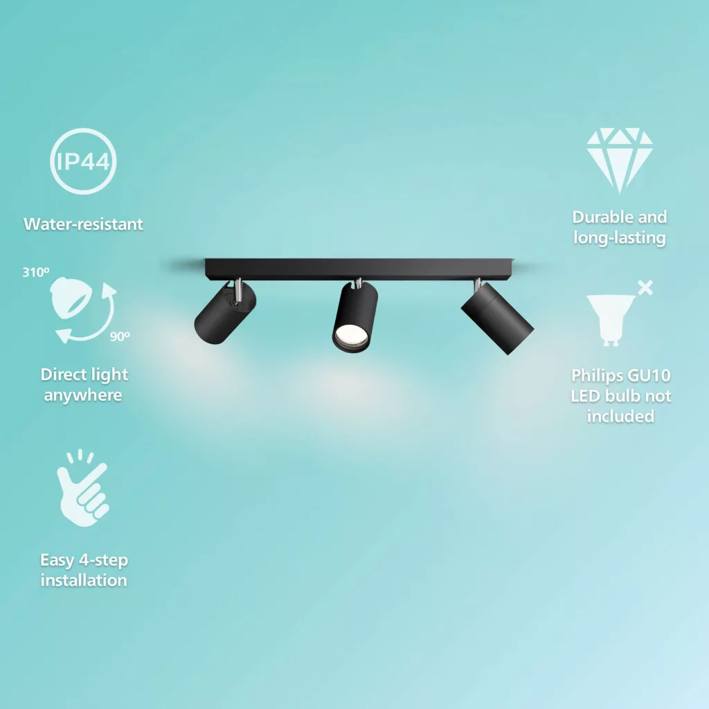 Mennyezeti lámpa Spotlámpa 3x GU10 IP44 Kosipo Fekete Philips