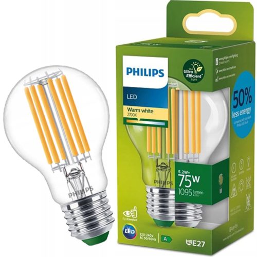 LED izzó E27 A60 210.6lm/W 5.2W = 75W 1095lm 2700K meleg izzószál PHILIPS Ultra Hatékony