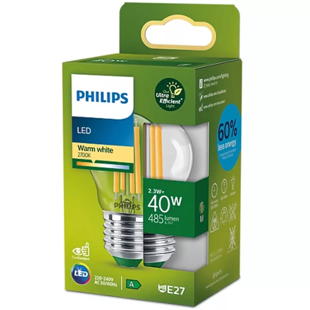 LED izzógömb E27 210lm/W P45 2,3W = 40W 485lm 2700K meleg izzószál PHILIPS Ultra Hatékony