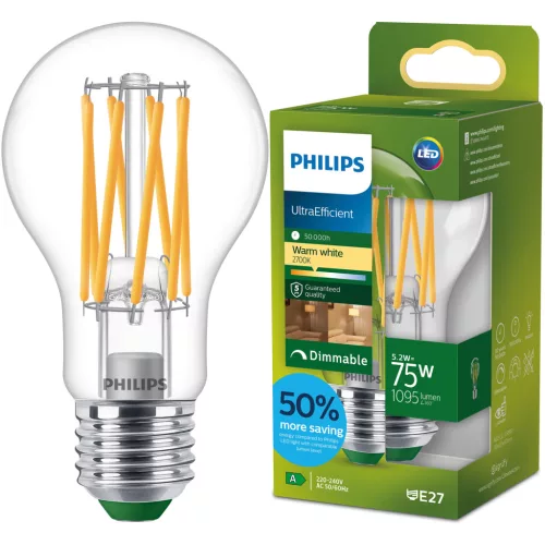 LED izzó E27 A60 5,2 W = 75 W 1095 lm 212 lm/W 2700 K Meleg 300° A OSZTÁLYÚ Szabályozható UltraEfficient Philips